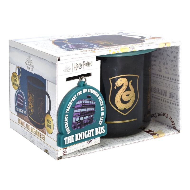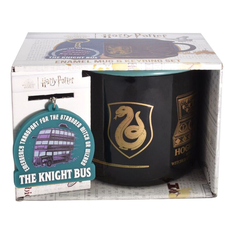 The durable and stylish Enamel Mug with collectable and chunky EVA keyring. Gold house crest prints to the mug and “Knight Bus” to the keyring.