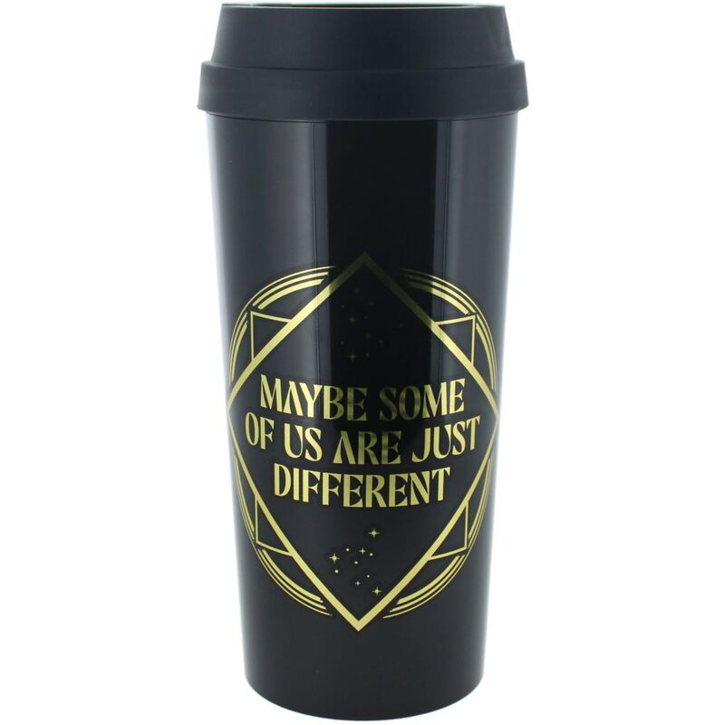 Take hot drinks on the go with you everywhere you go with this stylish Wicked inspired travel mug. It has a slide closure, so you won’t lose any of your valuable drink on the go. This slick black travel mug has gold foil design on both sides, one side is the Wicked logo and the other is the words Maybe some of us are just different. It can hold up to approximately 450ml, perfect size to keep you going.