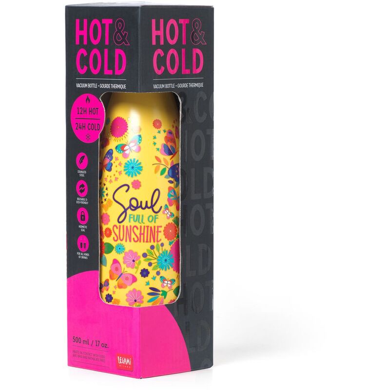 Say goodbye to plastic bottles and take-away cups with the Legami Hot&Cold 500ml Vacuum Bottle - Butterfly. Made of lightweight and resistant double-layer stainless steel, a hermetic seal and a removable silicone handle, keeping hot drinks warm for 12 hours and cold drinks chilled for 24 hours.