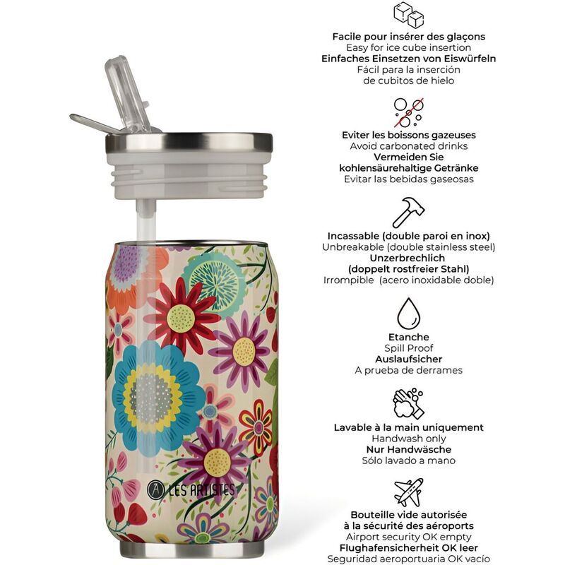 The isothermal can is an insulated flask designed as a can. Its double-wall stainless-steel technology maintain drinks hot for 5h and cold for 10h, with no impact on the drink's flavor.
