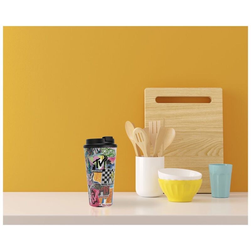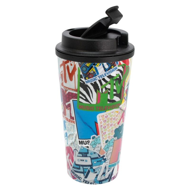 450ml double walled thermal travel flask with screw top lid and flip back hinged lid for anti spill. Rubberised base for anti slip.