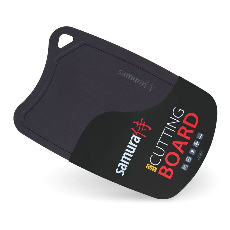 SAMURA cutting boards are made of thermoplastic polyurethane used for manufacturing modern health care products and products for children. During the cutting process the blade of your knife does not interact with a solid surface, like when cutting on a glass board, but instead gently and slightly cuts into the elastic material of the board thus protecting your knife from damage.