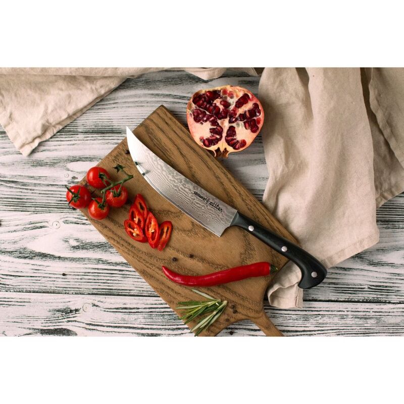 SAMURA SULTAN PICHAK is a truly exceptional kitchen knife inspired by the achievements of the great Ottoman Empire. It is a perfect addition to any kitchen collection due to its reliability, durability and unique style. The blade of the Pichak is forged from ultra strong 67 layered Damascus steel to form the shape of the classical Asian Pichak.