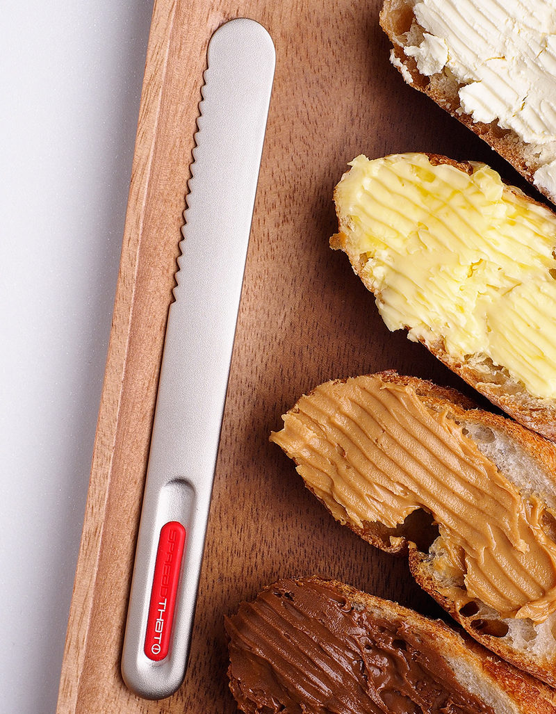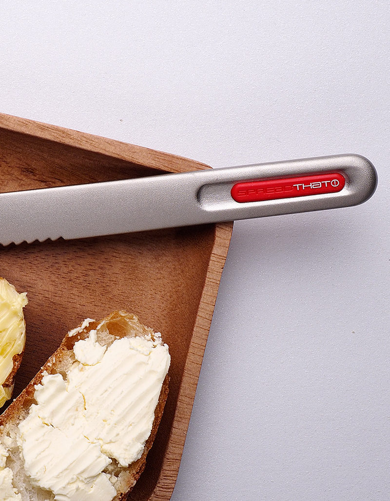 SpreadTHAT! softens butter for quicker, easier spreading by carrying warmth from the palm of your hand to the edge of the blade. Use the serrated edge to shave off fine curls of butter straight onto your toast, and then gently draw the blade over them for a smoother, more even layer of butter right out of the fridge. No waiting, no clumping - just a better slice of toast, made easy.