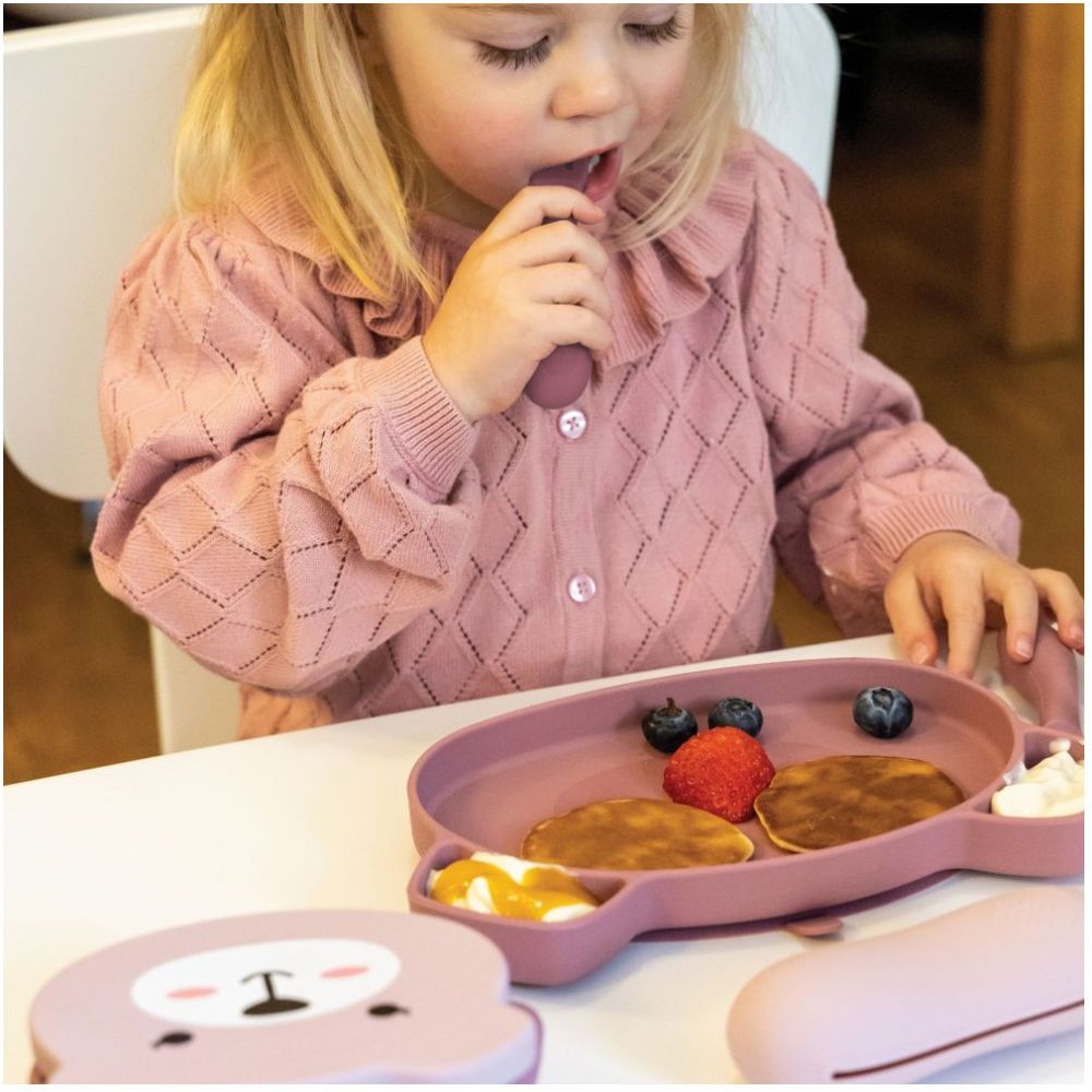 - Fork has a bowl-shaped nylon head for easy stabbing and scooping. Spoon has a soft and narrow silicone head for easy scooping and dipping. Small bumps on the rear stop it from rolling on the table