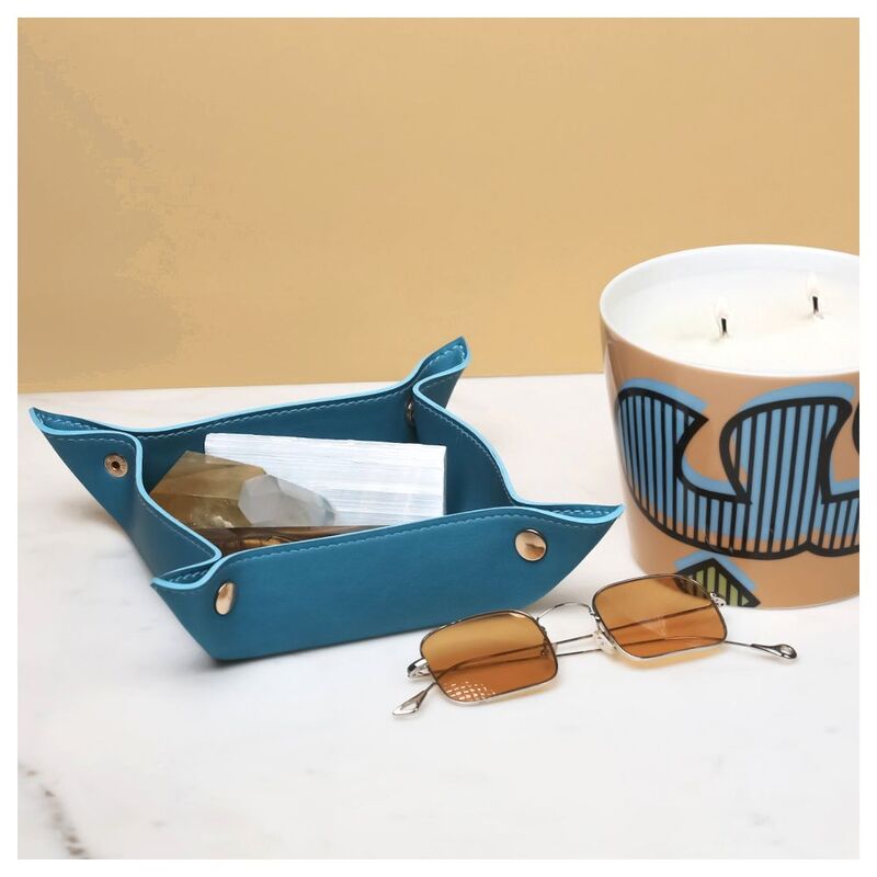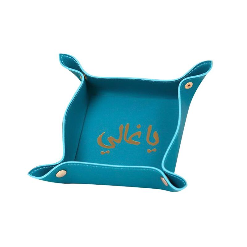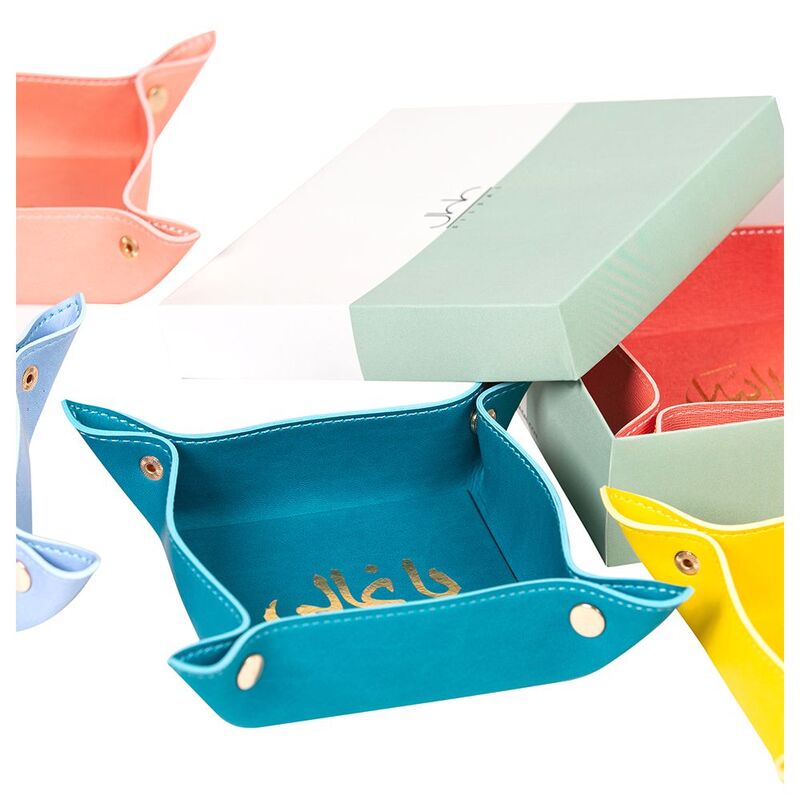 A thoughtful favor or sweet gift, this catchall tray is perfect for holding trinkets, change or jewelry. Expertly crafted from vegan leather, it's decorated with the words "Ya Ghali", meaning "Most Precious", in gold calligraphy. The perfect addition to your desk or bedside table, it keeps your daily essentials neatly in place.
