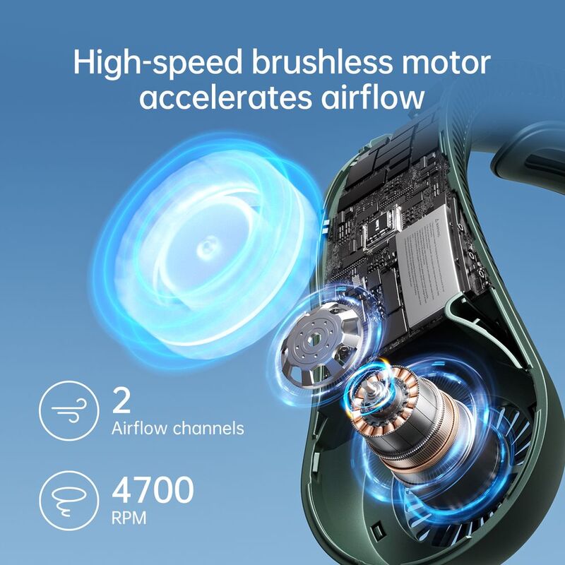 A portable neck fan equipped with a 4000mAh battery, which can last for 515 hours of continuous use depending on different usage gear. It only takes 2 hours to charge from 0% to full, providing you with coolness all day long