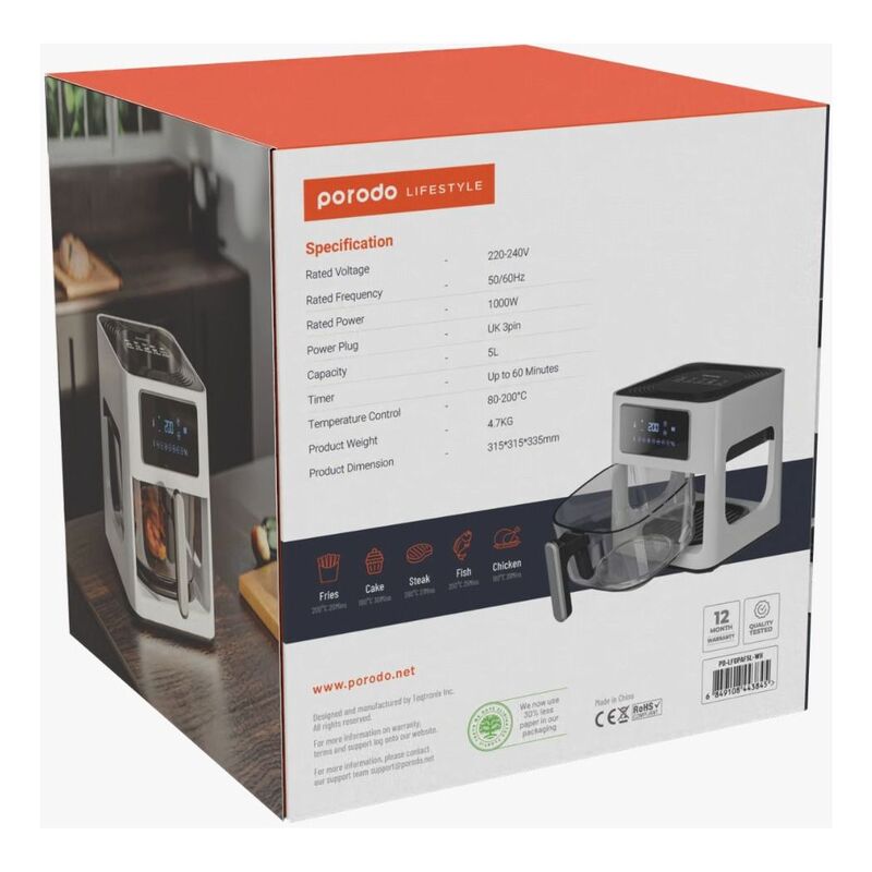 Porodo Lifestyle Glass Pot Air Fryer Touch Panel 6 Preset Options - White