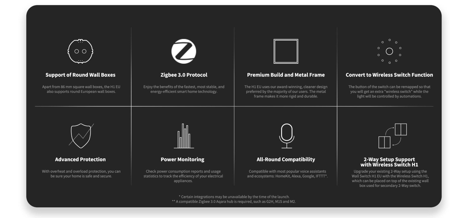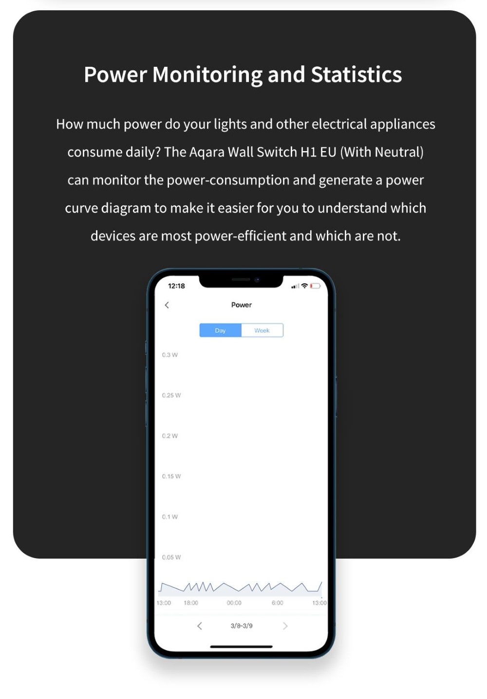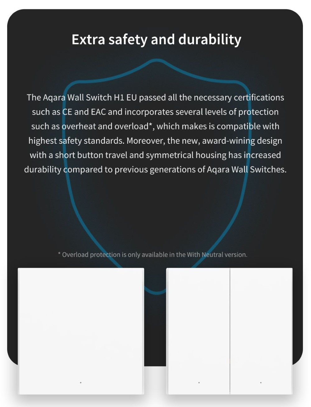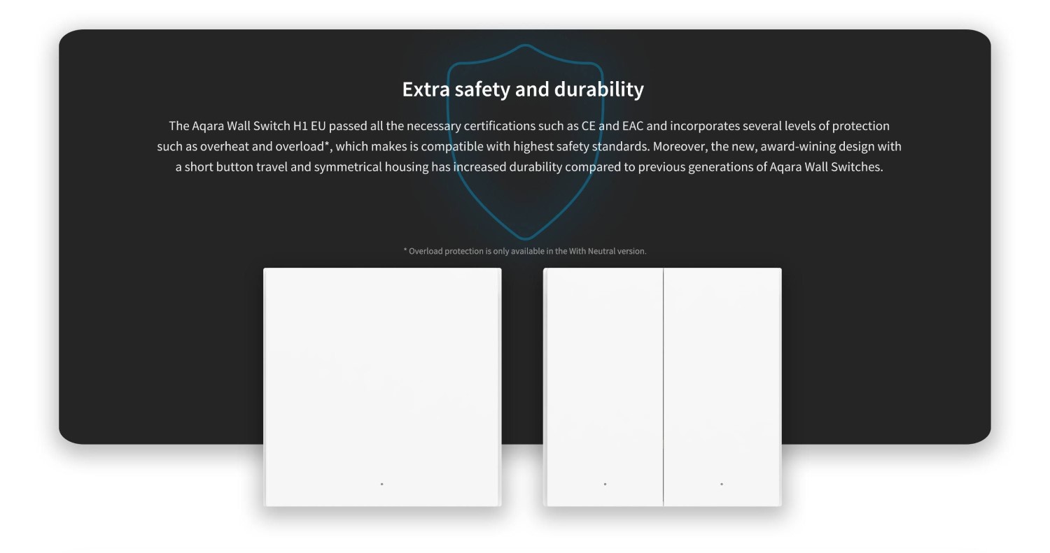 The upgraded Aqara Wall Single Switch H1 smart switch is mounted in place of a standard round outlet. The"neutral wire" version of the switch requires a connection to the neutral wire and offers enhanced functionality: electricity consumption statistics, status memory and overload protection.