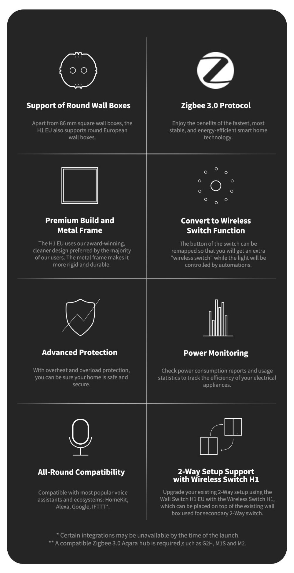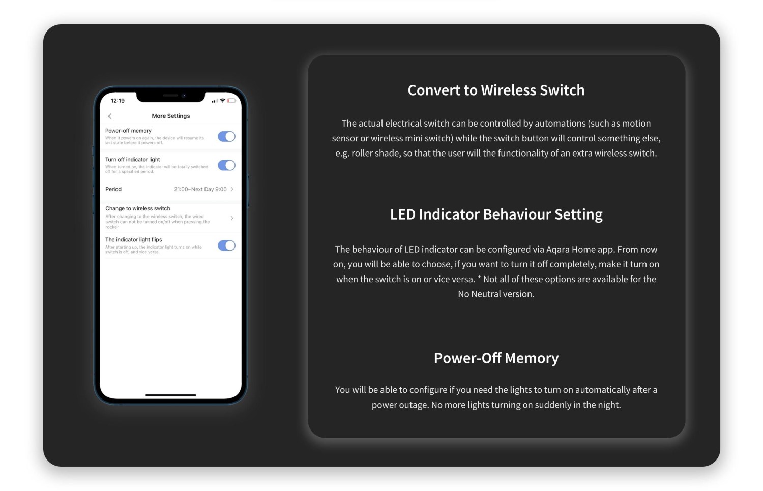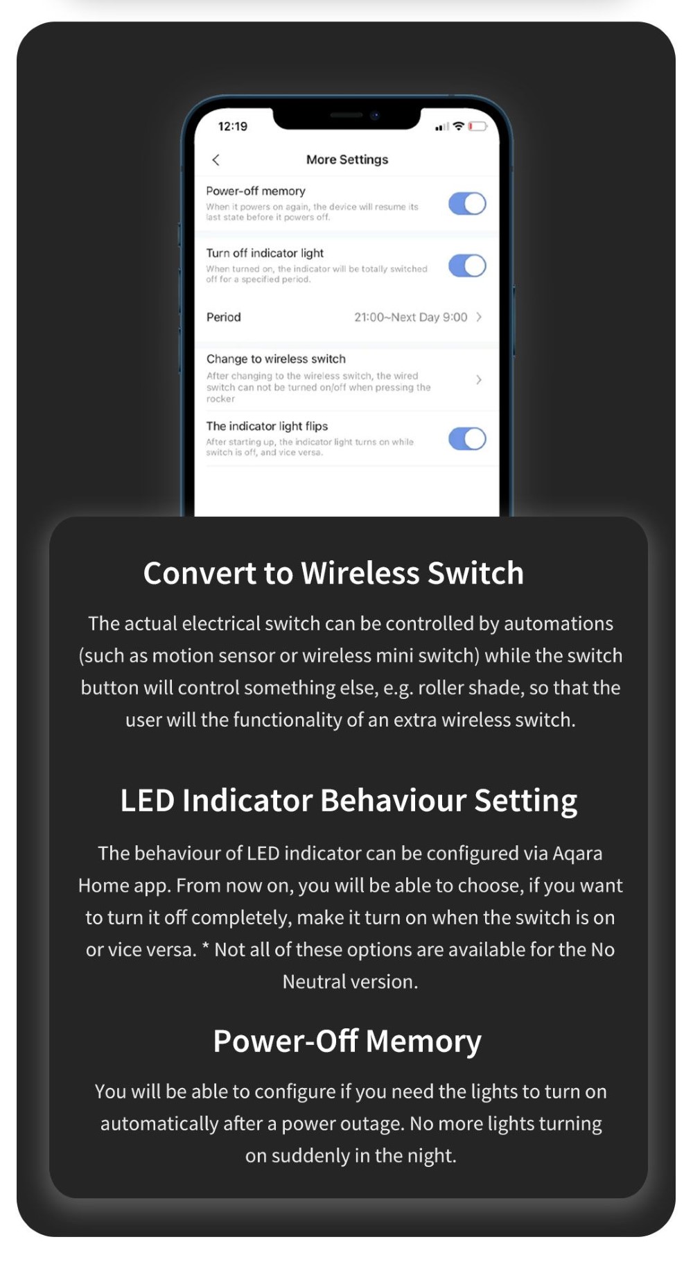 Now it's really easy to make all the lighting in your home smart. Simply replace conventional switches with Aqara switches and control your lighting remotely using the Aqara Home app or with automated scripts. The switch can switch loads up to 8 Amps.