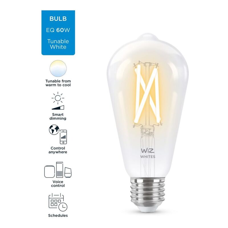 The Edison-style shape and warm to cool white light of this WiZ smart Filament bulb gives you a vintage look in any room. Use with the WiZ app or your voice to dim and brighten or use preset light modes on Wi-Fi setups.