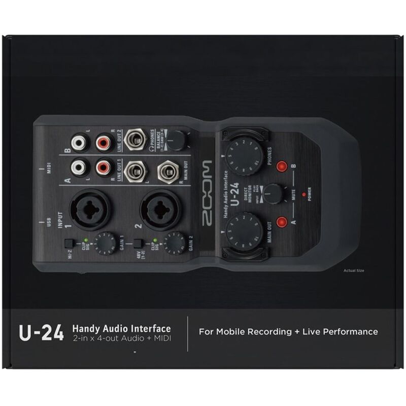 Zoom's U-24 Handy Audio Interface makes it easy to record anywhere on your laptop or iPad at up to 24-bit/96kHz resolution. This pocket-sized portable USB recording interface includes a pair of Zoom's top-quality preamps with phantom power on TRS/XLR combo inputs, and you can even plug in your guitar and record direct. Balanced TRS and unbalanced RCA outputs accommodate studio monitors and DJ systems, and onboard MIDI lets you hook up your keyboard or other MIDI gear. What's more, the U-24 can run for up to four hours on just two AA batteries, so you're good to go, even if USB bus power isn't available.