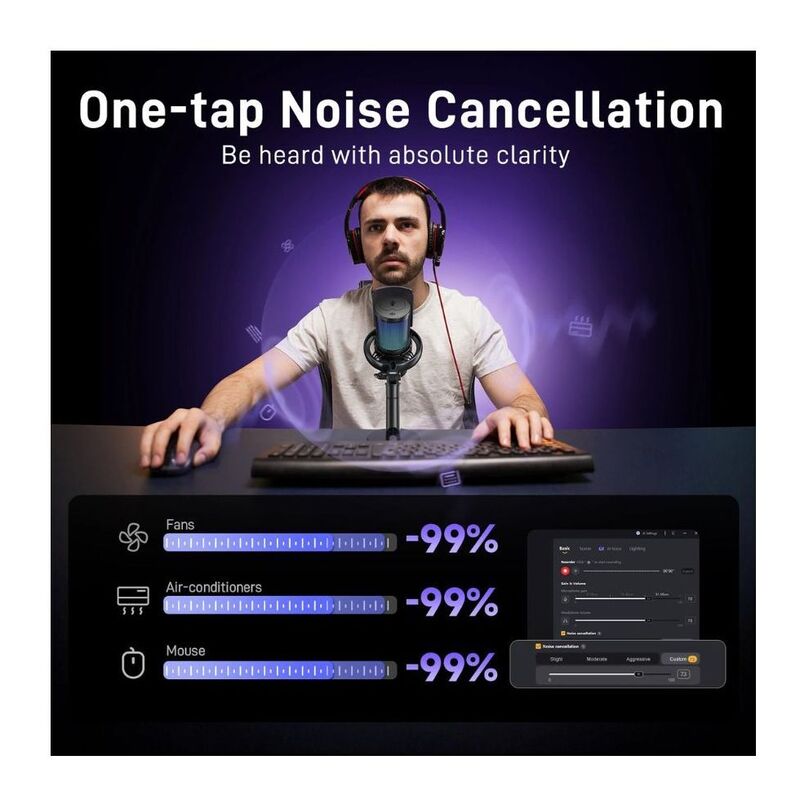 The Maono DM40 Pro is a feature-rich wireless USB microphone tailored for gamers, streamers, and content creators. It offers up to 75 hours of battery life, 48kHz/24-bit broadcast-quality sound, and seamless wireless freedom for a clutter-free setup. With 10 fun AI voice effects (via PC using Maono Link), one-tap adjustable noise cancellation, and customizable RGB lighting, it brings both creativity and clarity to your sessions. The Maono Link app provides smart control over EQ, voice modes, volume, and monitoring, while wide USB/USB-C compatibility ensures effortless plug-and-play use across PCs, Macs, and mobile devices.