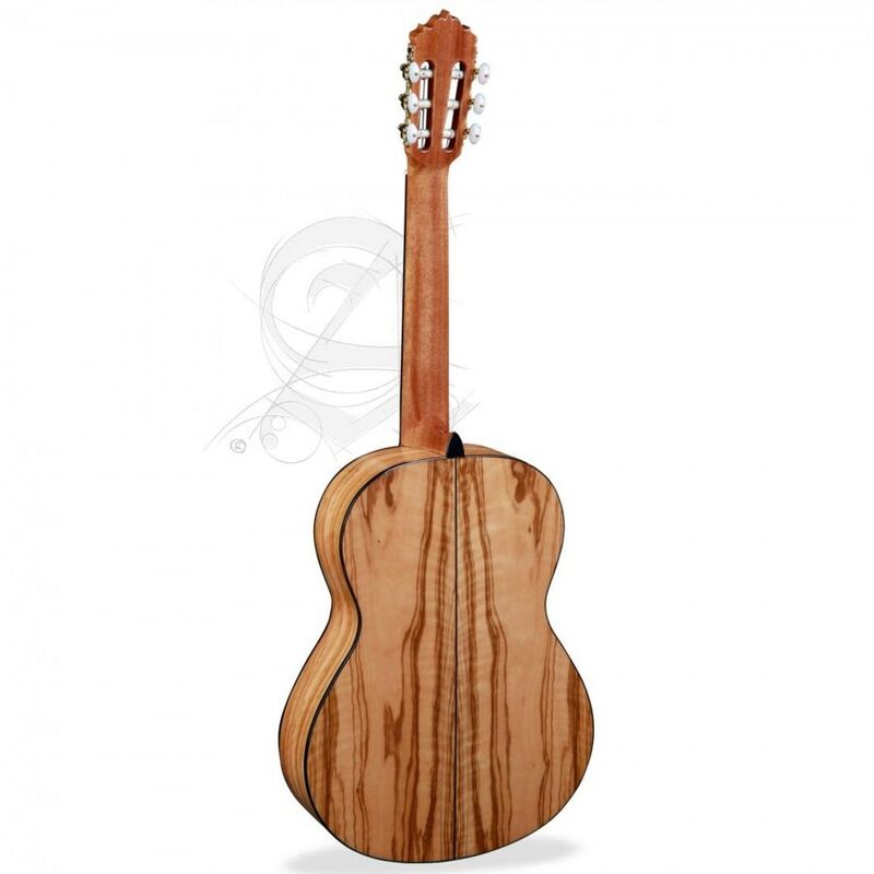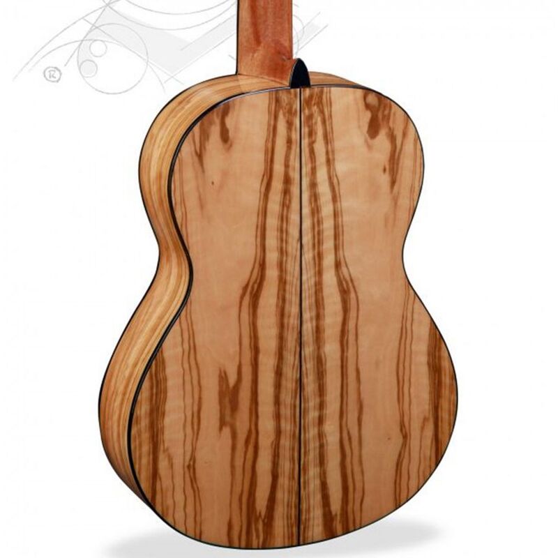 The 6 Olive is a remarkable guitar: the guitar is made of olive wood. This is fairly rare, but is a great choice for a guitar. Olive wood sounds clear and articulates well. It emphasizes the mids and highs and has great projection. In addition, it also has a beautiful pattern because the olive tree grows in a rotating movement. The top of the guitar is made of cedar wood, which gives the guitar a warmer sound. The neck is made of samanguila and the fingerboard is made of ebony. In short, the 6 Olive is a great and unique classical guitar!