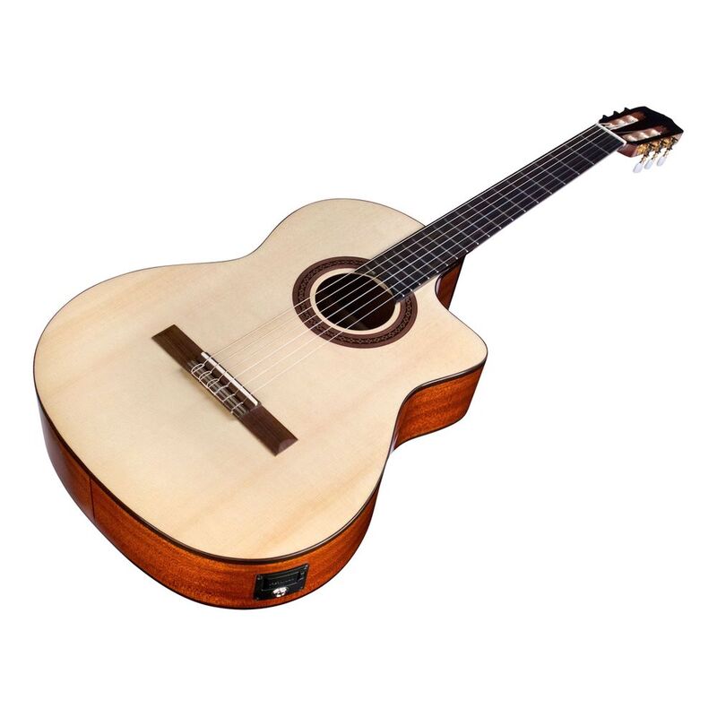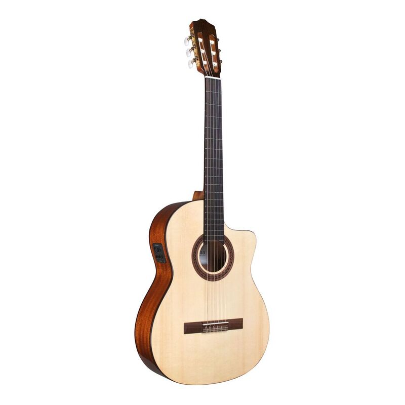Based on Córdoba's top-selling C5-CE, the C5-CE Spruce adds a new option to a fan favorite. A soft cutaway provides easy access to the upper register, and a Fishman Presys II preamp amplifies your signal for stage and studio. Perfect as a first nylon-string guitar and ready for gigging, this lightweight model is built with a solid Engelmann Spruce top and Mahogany back and sides to produce a clear, powerful tone with beautiful sustain. Handmade in the traditional Spanish style, the C5's carved headstock, hand-inlaid wood rosette, Indian Rosewood binding, Savarez strings, and glossy PU finish result in a guitar that truly stands out from all other entry-level options. A lightweight adjustable truss rod is built into the neck for stability. Available in Natural finish with solid Engelmann Spruce top.