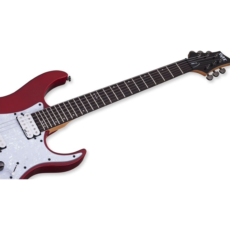 Its roster features a number of both active and passive models, reaching from lower intermediate to upper intermediate classes. Banshee 6 SGR starts off with a flat-top Banshee body, bolt-on neck, 25-1/2" scale, and Schecter electronics and hardware. Five conservative color options are available for this model. Core construction features include a solid basswood body (flat top, Strat-like pickguard, contoured back), maple neck (C profile, four-bolt joint), and rosewood fingerboard (extra jumbo frets, offset dot inlays, 14" radius). Schecter`s Diamond Plus pickups, string-through hardtail bridge, and die-cast tuners complete this affordable shredder.