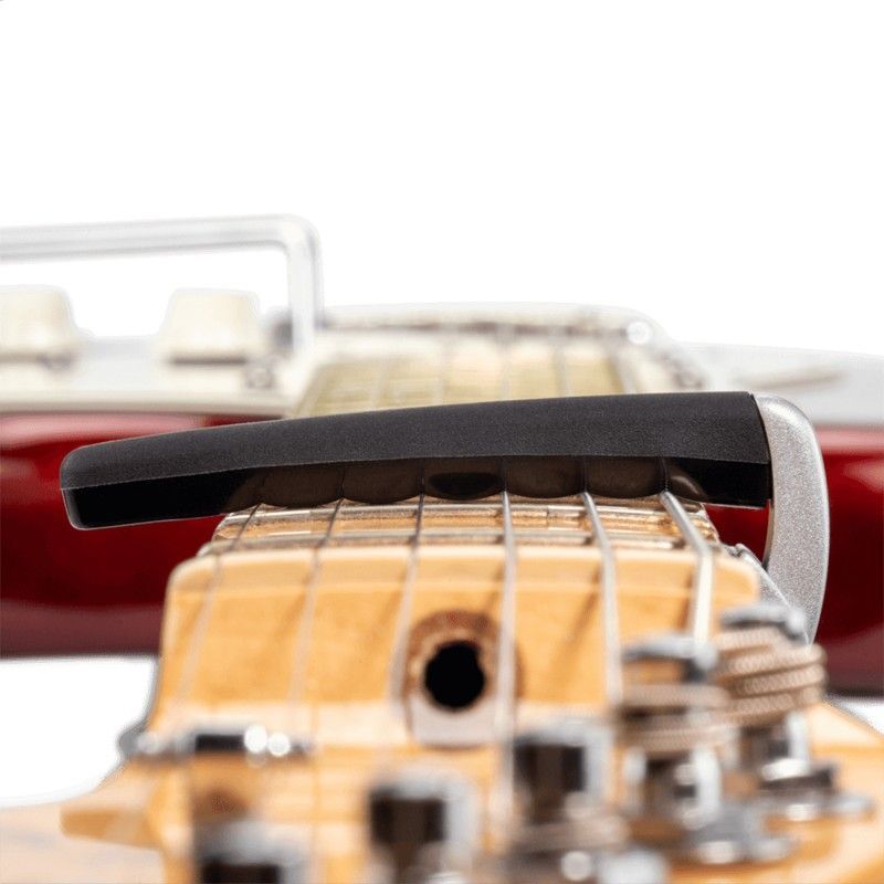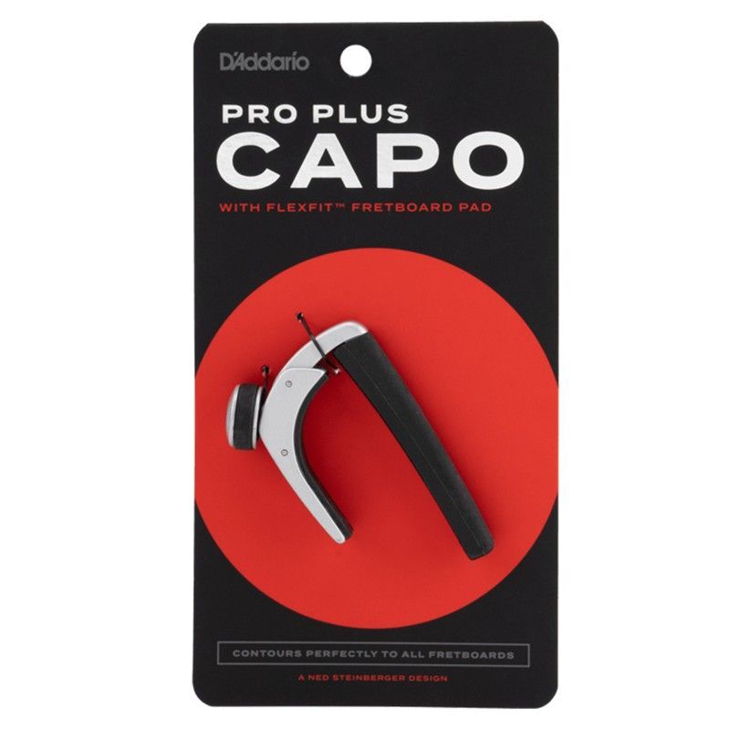Thanks to our revolutionary, FlexFit™ technology, the pad used on the capo arm of the D’Addario Pro Plus Capo mimics the way the anatomy of the human finger functions when fretting a string--so you never have to worry about unwanted buzzing, muted strings, or intonation issues caused by varying capo pressure. With minimal overall pressure every string rings clear, clean, and in tune. The Pro Plus is designed to function perfectly on virtually all guitars, including flat fingerboard classical guitars, all the way to vintage electrics with a 7” fretboard radius. Available in Black and Silver.