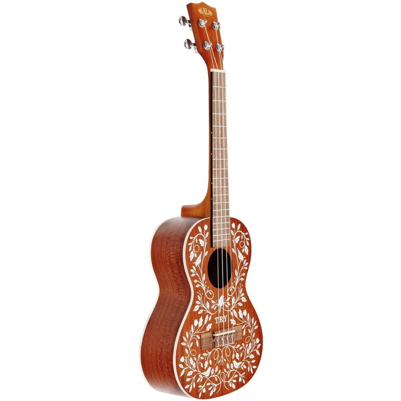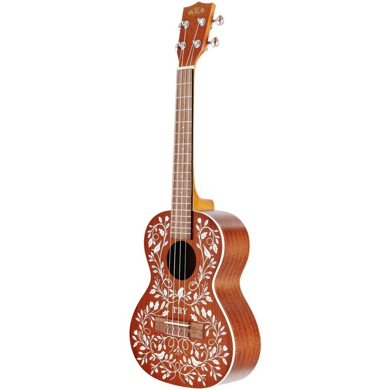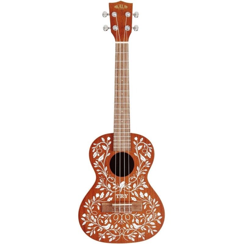 The Mandy Harvey Learn To Play Signature Series Tenor Ukulele is made of Satin Mahogany and includes white binding and original artwork reminiscent of 1800s Swiss folk art. The delicate vine pattern with birds and flowers was created by Mandy’s sister, making this a very personal, one-of-a-kind piece of art.