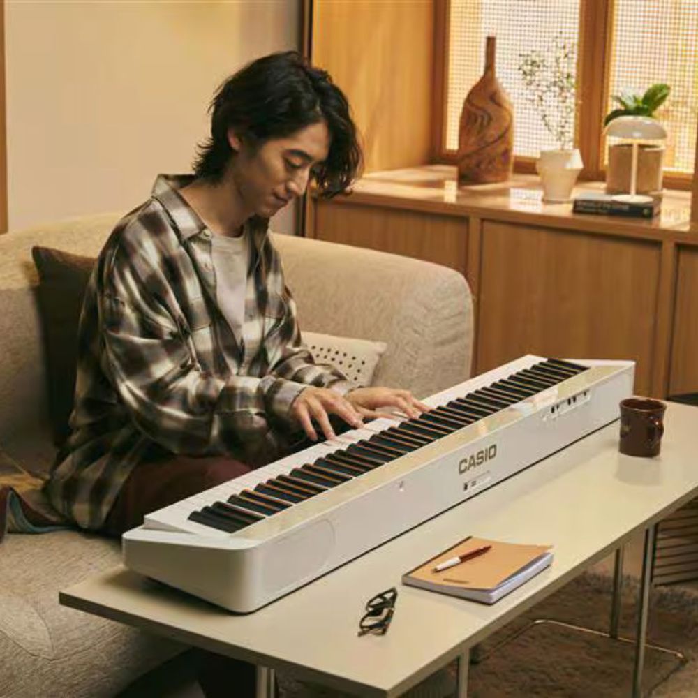 The Casio Privia PX-S1100 is a portable digital piano ideal for students, hobbyists, and accomplished pianists, delivering realistic grand-piano sound and feel through its 88 simulated ebony and ivory textured keys and scaled, hammer-action keyboard with high-quality instrument sounds and an enhanced speaker system. Weighing only 25 lb, it runs on either the included power adapter or six AA batteries, allowing you to play anywhere. Its slim, space-saving chassis is barely larger than the keys themselves, making it perfect for small spaces, while its simple, minimalist design complements a variety of room interiors.