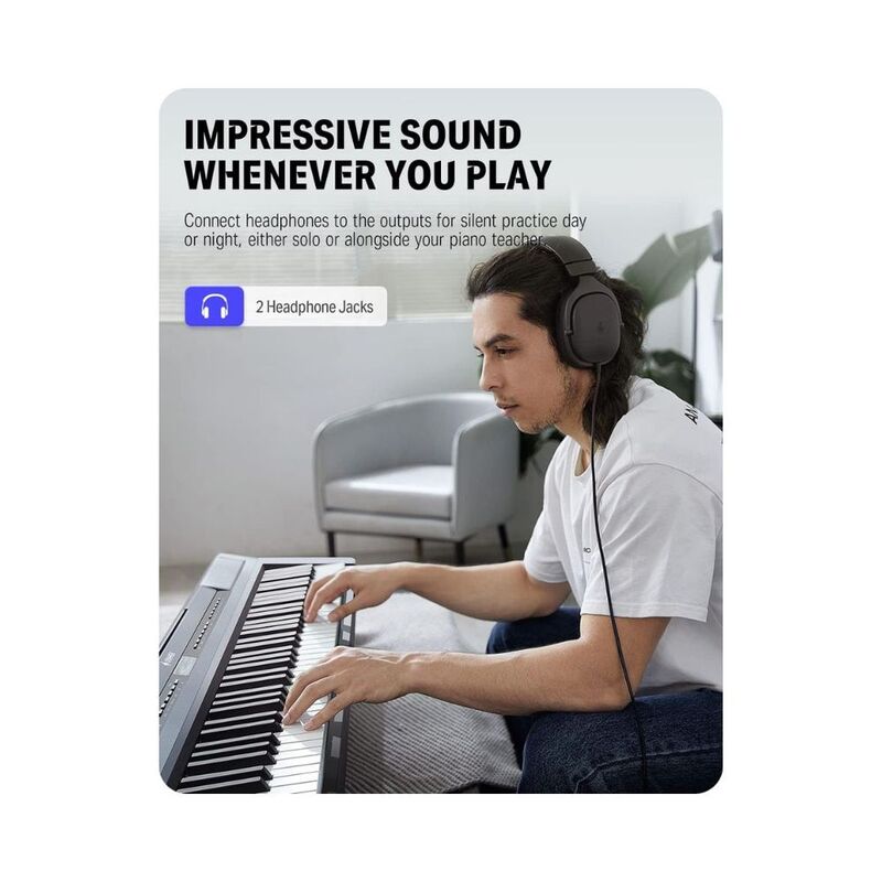 The Donner DEP-20 boasts a slim cabinet design that enhances its attractiveness and ensures it blends seamlessly with any decor. Its space-saving design allows for easy transportation between rooms, facilitated by its lightweight construction. Built-in brackets provide convenient storage for sheet music and mobile equipment, adding to its practicality.