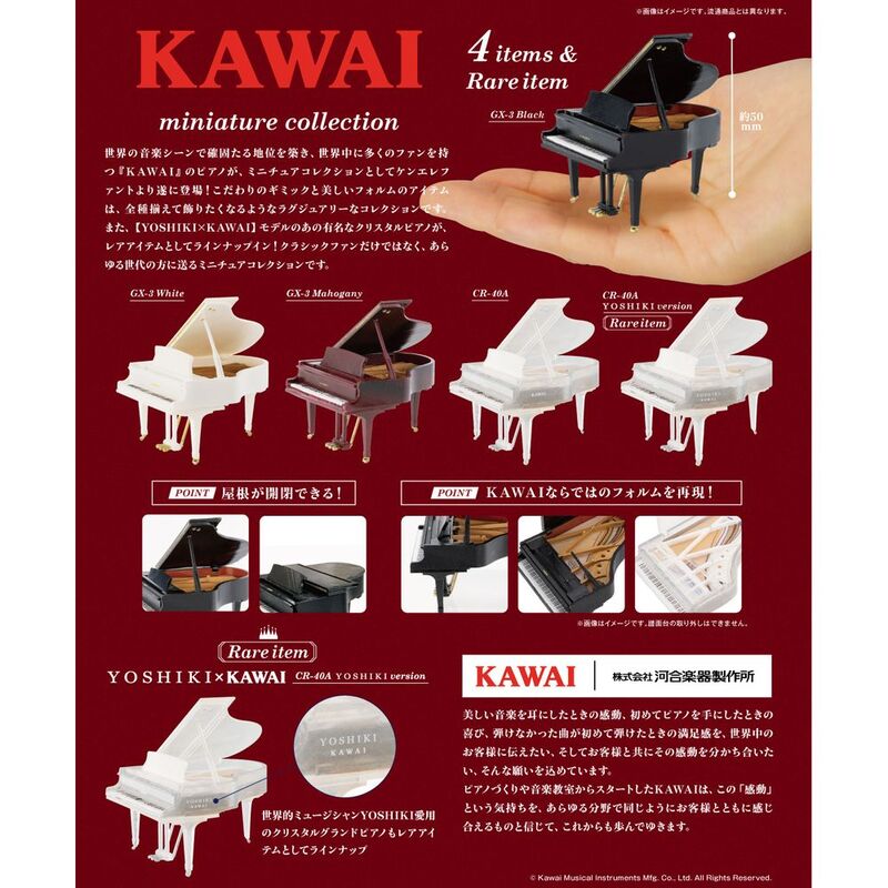The Kawai Miniature Collection is a delightful series of miniature pianos created to celebrate Kawai’s dedication to producing high-quality pianos. This collection includes four different palm-sized pianos. These miniatures are perfect for collectors and enthusiasts of Kawai pianos.
