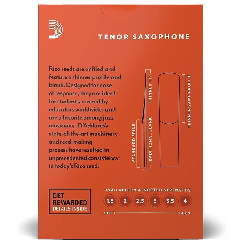 Tenor Saxophone Reeds, Box of 10 Strength 2 Designed for a wide variety of playing situations, Rico Tenor Saxophone Reeds are cut of the most flexible grade of cane. The ease of play, affordable price, and convenient packaging are why more musicians worldwide choose Rico reeds.
