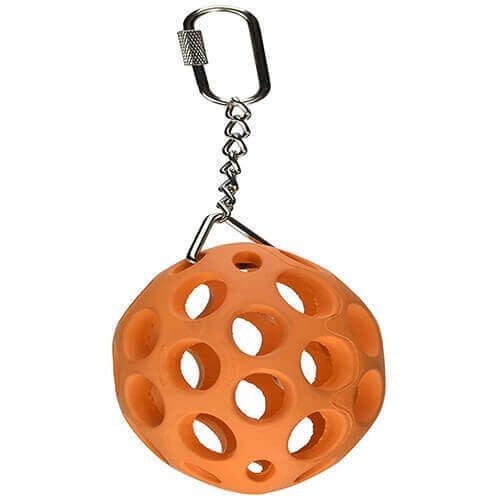 The Nutcase Activitoy is a stretchy all natural rubber football shaped toy that hangs from a chain inside the cage. This soft flexible rubber is tough and can be stretched and filled with your birds favorite nuts or treats. The small cut outs in the rubber allow your bird to hold it and to manipulate the toy to remove the treats inside. This toy is both intellectually and physically challenging to your bird. Great for parrots of all sizes.