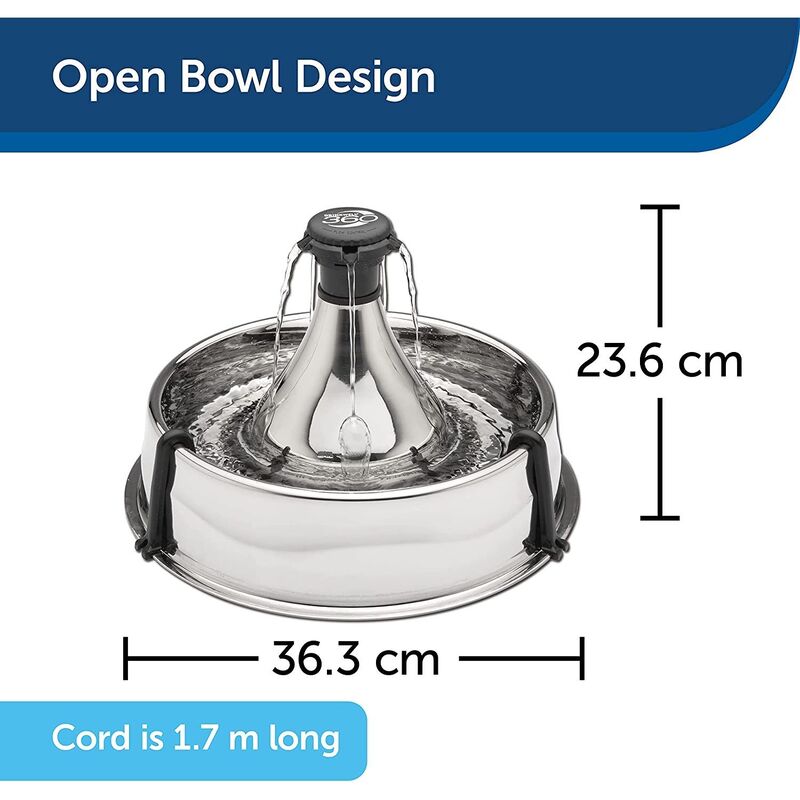 Developed by a veterinarian, the Drinkwell 360 Stainless Steel Pet Fountain provides 128 oz (1 gal) of fresh, filtered water to your pet. Multiple free-falling streams of water entice your pet to drink more and continually aerate the water with healthful oxygen. A charcoal filter removes bad tastes and odors, giving your pet the best way to stay hydrated. The 360's multiple streams and circular design allows pets to drink from any angle and is great for multiple pet households. Stainless steel is the #1 material recommended by vets for the most hygienic pet dishes. Replaces SKU D360SS-RE.1 gallon (128 oz) water capacity waterIdeal for multiple cats and dogs under 60 poundsPatented free-falling stream entices pets to drink moreReceiving ramp and adjustable flow control reduce splashingInterchangeable spout rings provide 1-5 water streamsReplaceable charcoal filter removes bad tastes and odorsSubmersible pump for nearly silent operationDishwasher safe (excluding pump)For indoor use only