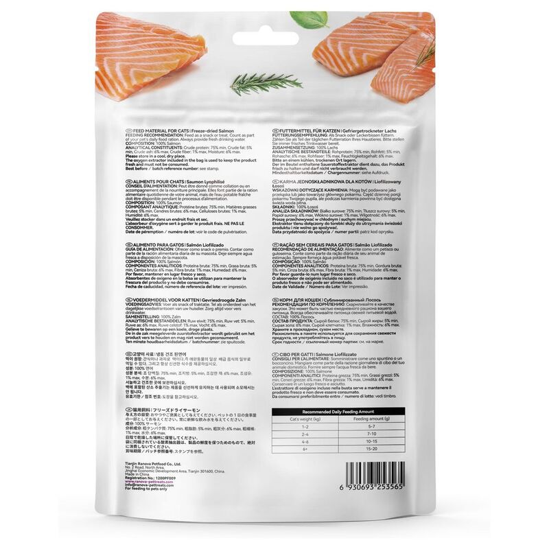 Freeze-dried salmon for cats is a premium, high-quality protein option made from real salmon. This process involves freezing the salmon at low temperatures and gently removing moisture, preserving its natural taste, nutrients, and texture. It's a sought-after choice among pet owners looking to provide their feline companions with a nutritious, minimally processed treat or meal.