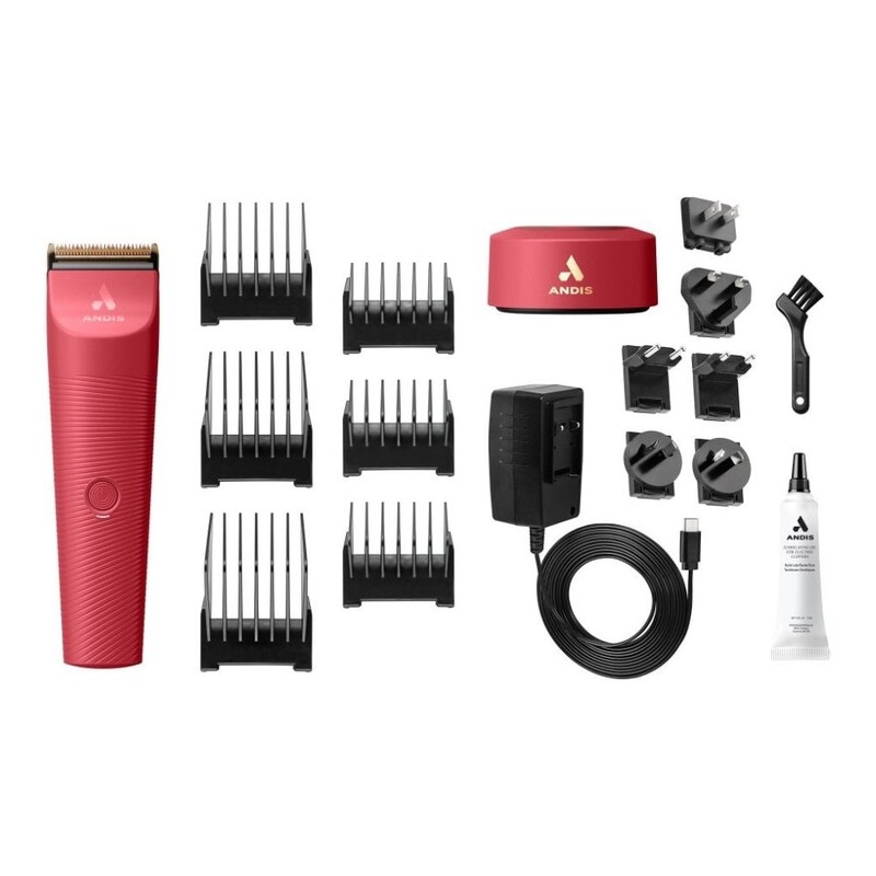NEW from Andis, comes the Vida Cordless 5 in 1 Trimmer and Clipper in a vibrant shade of Raspberry red. Features a slim, lightweight design to help reduce hand fatigue as well as ergonomic ribbed housing to ensure grip. This is a midi size cordless clipper and trimmer in one that sits between a mini trimmer and full size clipper. Check 'rated for' and coat types below before you buy.