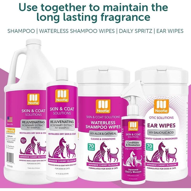 Nootie's Daily Spritz Japnese Cherry Blossom - The exhilarating aroma of our fragrance will keep your dog smelling fresh and clean between baths while conditioning the skin and coat. Nootie's Daily Spritz is made with natural ingredients and is soap and paraben free. It's long lasting. and made with a gentle, conditioning formula that contains no sulfates or harsh chemicals.- Long lasting fragrance- Made with natural ingredients- Soap & Paraben Free- No sulfates or harsh chemicals- Safe to use along with topical flea & tick productsIngredientsPurified Water, SDA 40B Alcohol, Nonoxynol 9, Polyquaterinium- 7 (conditioner), Glycerin (moisturizer), Kathon CG (preservative), infused with essence of Japnese Cherry Blossom