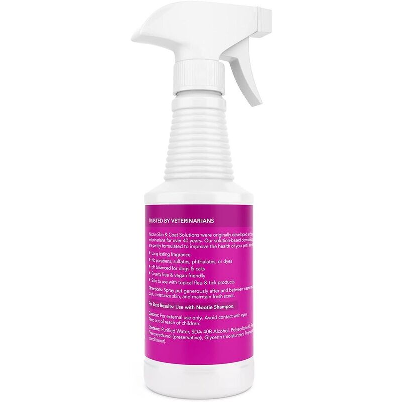 Nootie's Daily Spritz with our exotic Japanese Cherry Blossom fragrance will keep your dog smelling fresh and clean between baths while conditioning the skin and coat. Nootie's Daily Spritz is made with natural ingredients and is soap and paraben free.- It's long lasting and made with a gentle, conditioning formula that contains no sulfates or harsh chemicals- Safe to use with topical flea and tick productsIngredientsPurified Water, SDA 40 Alcohol, Nonoxynol 9, Polyquat 7, Glycerin, infused with essence of Japanese Cherry Blossom, Preservative16 oz
