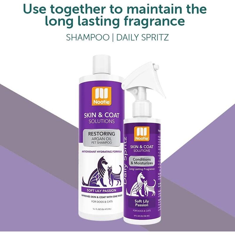 Nootie's Restoring Argan Oil Shampoo infused with the exhilarating scent of Soft Lilly Passion, helps restore softness and shine with natural antioxidant nutrients Vitamin E & Omega-6 Fatty acids.- Antioxidant Hydrating Formula- Made with natural ingredients- Soap & Paraben free- No sulfates or harsh chemicals- Safe to use along with topical flea & tick products- Safe to use on catsIngredients:Purified Water, Sodium C14-16 Olefin Sulfonate, Polyquaterinium- 7 (conditioner), Cocamidopropyl Betaine, Ethylene Glycol Distearate, Laureth-4, Glycerin (moisturizer), Sodium Chloride, Citric Acid, Kathon CG (preservative), Argan oil, Safflower Oil, Oatmeal Extract, infused with essence of Soft Lilly Passion.