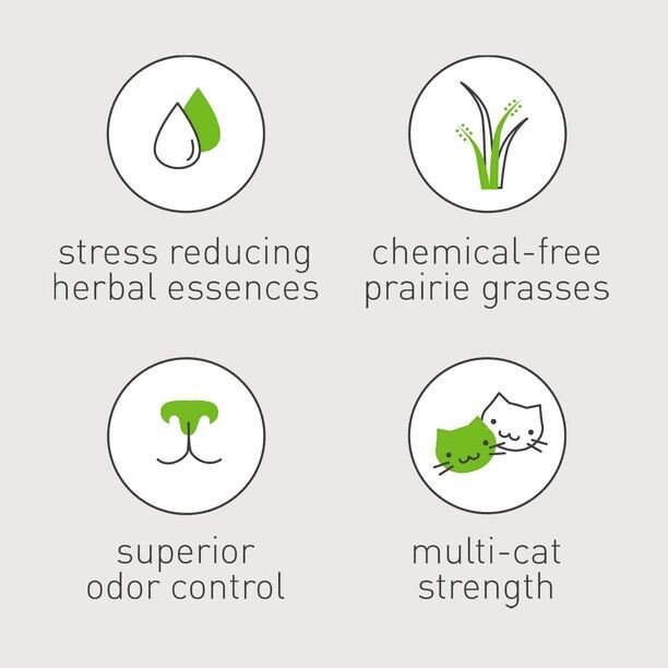 Do you have a cat that wants to go outside or are you looking to enrich your cat’s environment? You may have observed stress behaviors like pacing, scratching furniture or rugs, aggression, increased vocalization, excessive grooming or urine marking. Touch of Outdoors® with natural, chemical-free prairie grasses grown in our fields can help your cat feel less anxious, bored and depressed, translating into a happier cat environment. Each box has a free Litter Box Solutions Booklet to help cat owners solve their litter box problems. Touch of Outdoors® Litter has natural chlorophyll for odor control.