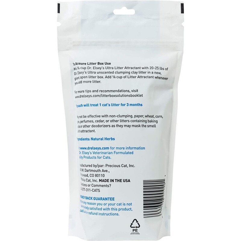 Mix 1 4 cup with 20-25 lbs of Dr. Elsey's Ultra Unscented Clumping Clay Litter in a new open litter box. Add 1 8 cup Litter Attractant whenever you add more litter. Do not use with paper, wheat, corn, conventional, pine, perfumed, cedar, or litters containing baking soda or other deodorizers since they may mask the smell of the attractant."