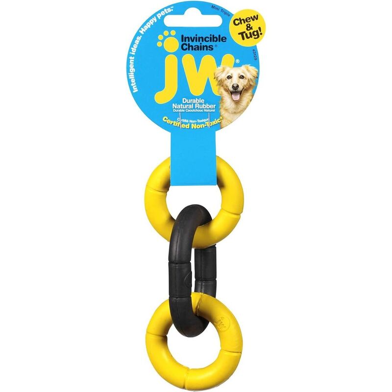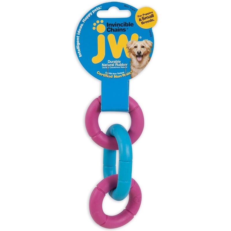 Invincible Chains is made up of three durable rings composed of natural resilient rubber. JW's patented molding process links each ring together with no seams and no glue to produce a strong long lasting toy. Tug, toss, fetch and chew the Invincible Chain will provide hours of fun for your dog. Excellent for small and toy dog breeds.