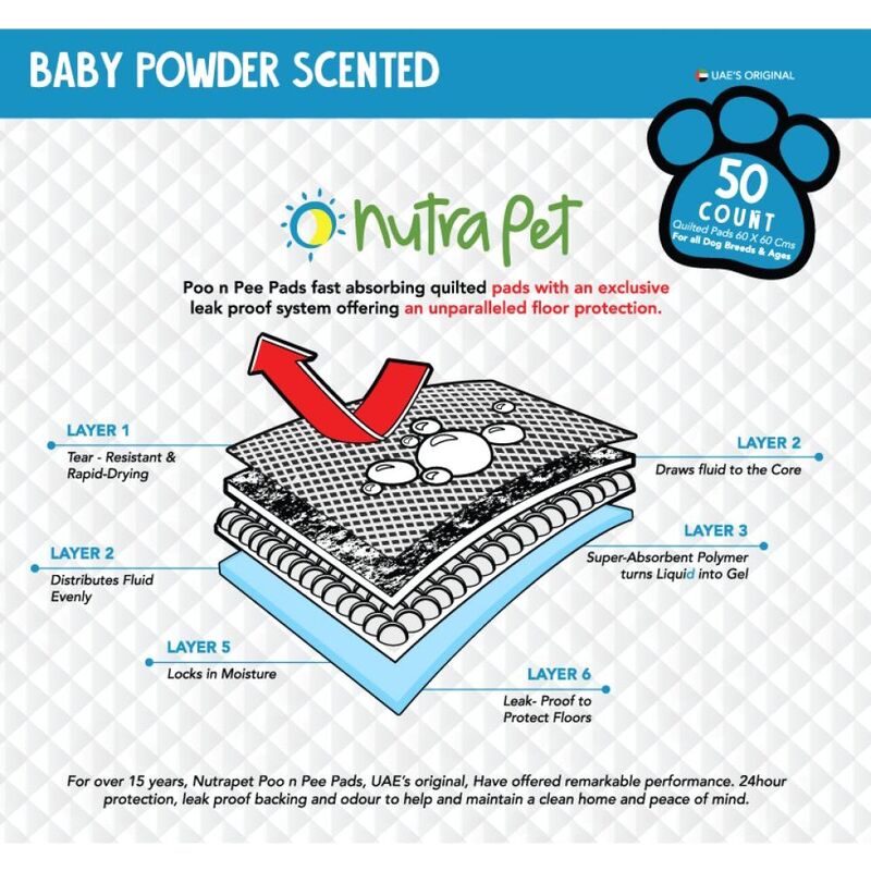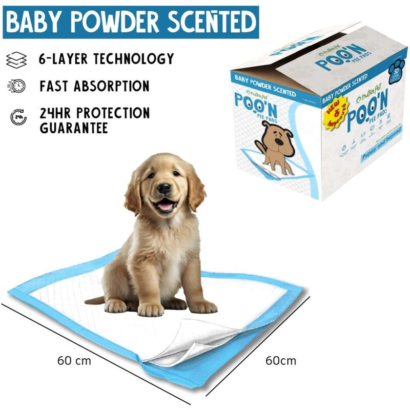Nutrapet Poo N Pee Pads Baby Powder Scented combine functionality, convenience, and a pleasant aroma to make pet care and training a more enjoyable experience for both you and your pet.