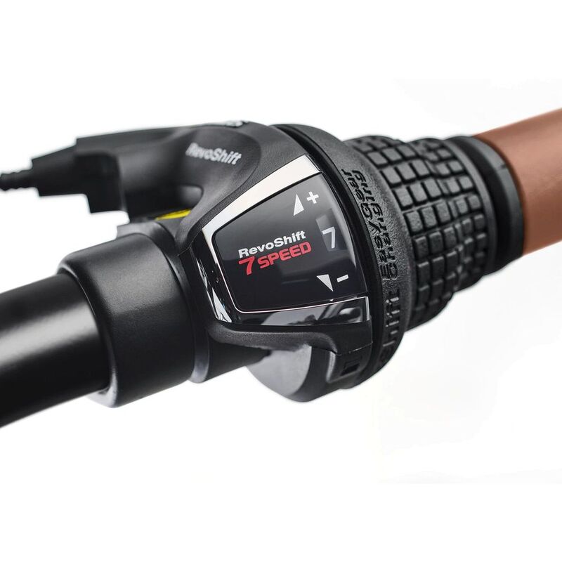 - The Shimano Revo shifter delivers smooth gear shifting, helping to climb hills easily. Brakes control deceleration for swift stopping, while 26-inch Bontrager tires roll smoothly turning the ride into an unforgettable experience
