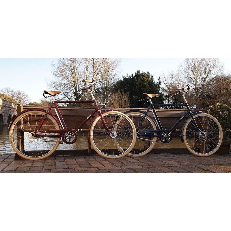 The classic chainguard and mudguards keep you clean and looking your best, whilst the reliable hub brakes and gears are effective no matter what the weather conditions. Comfort is enhanced by the inclusion of soft cork grips and a hand-made sprung Brooks aged leather saddle that is made only thirty miles from our factory, which gradually shapes to your form to become a truly customised and supportive seat. A front dynamo headlamp and rear LED light keeps you visible at night, and a sturdy ‘kick-down’ propstand allows you to stand your bicycle upright with ease.