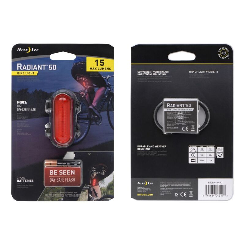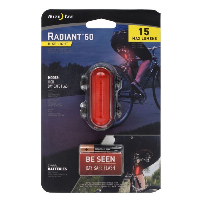 Ideal for family bike rides or for commuter cyclists, the Radiant 50 bike light is red for headlight or taillight use and can be set to constant or day-safe flash. It has a curved grippy rubber back and comes with two sets of attachment bands so it can be mounted horizontally or vertically in a variety of places on a bike like the handlebars or seat post. With a light housing that provides 180 deg of light visibility, the Radiant 50 is an ideal front or rear indicator light to make riders seen and safe, day or night. The silicone attachment bands hold the light securely in place, but also allow it to be quickly removed when parking your bicycle. Weather-resistant and powered by three AAA batteries, the Radiant 50 is a great indicator light to accompany you on all your rides.