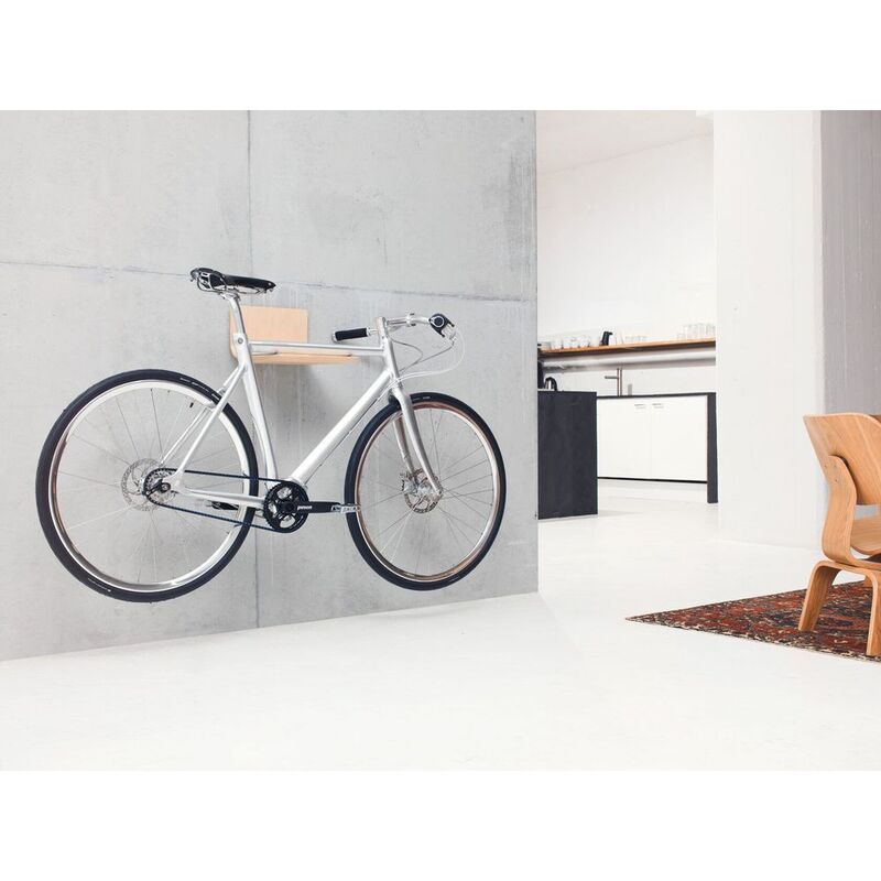 With the smart wall mount made of special wood types, the bike has a matching counterpart. Easy mounting procedure makes it easy to fix on the wall and use. A discreet rubber pad keeps the contact points from scratches. It fits a handlebar width up to 660 mm. High-quality veneer. Made in Germany.