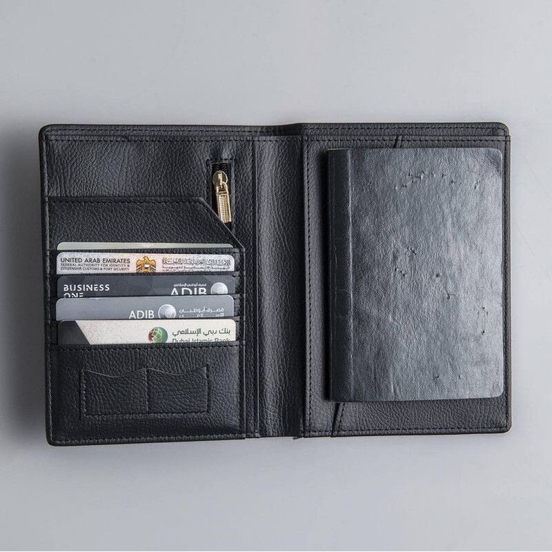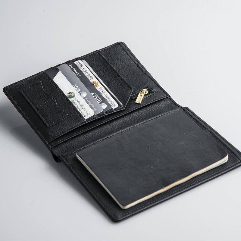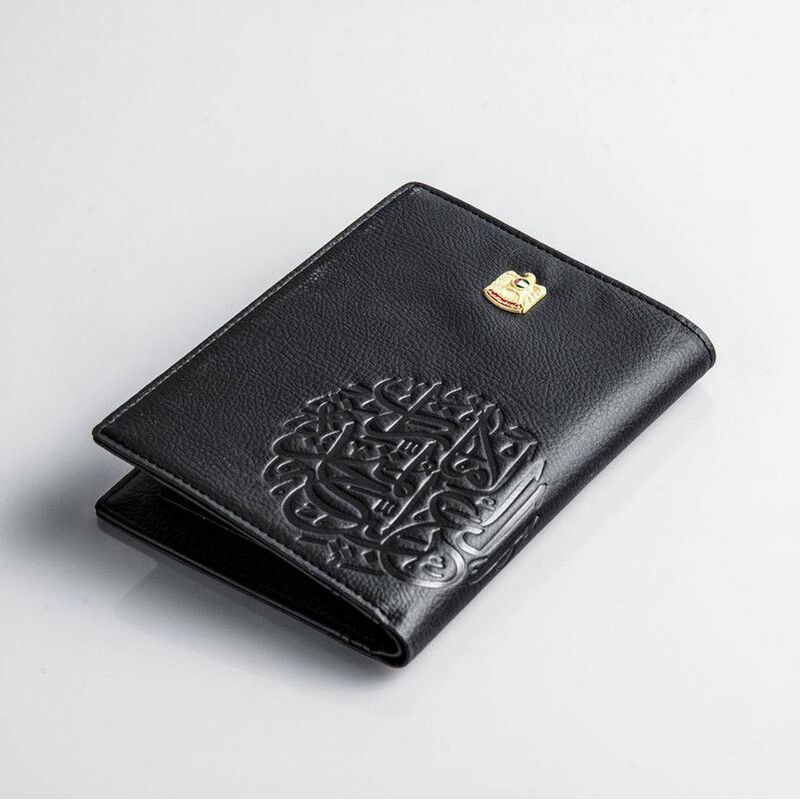 PU leather passport holder engraved with UAE emblem & Metal state logo attached. With multiple pockets of cards, special pocket with cash zipper, pocket to put the phone and sim card inside the wallet and with special Passport & Ticket pockets.