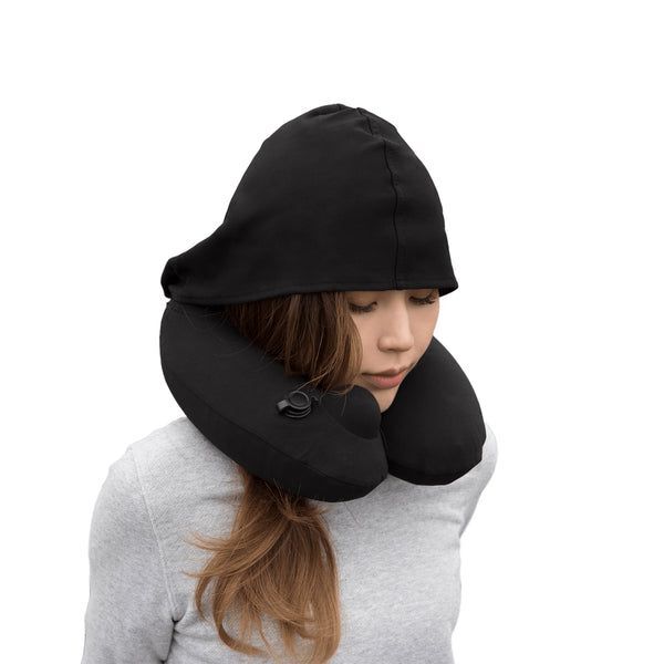 Travelmall World's First 3D Inflatable Neck Pillow With Patented Pump And Foldable Hood - Black