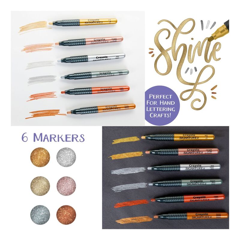 • Create: Crayola Signature metallic Paint Markers offer lustrous, shiny metallic effects in a smooth flowing marker. They make a perfect addition to your pencil case or art supplies