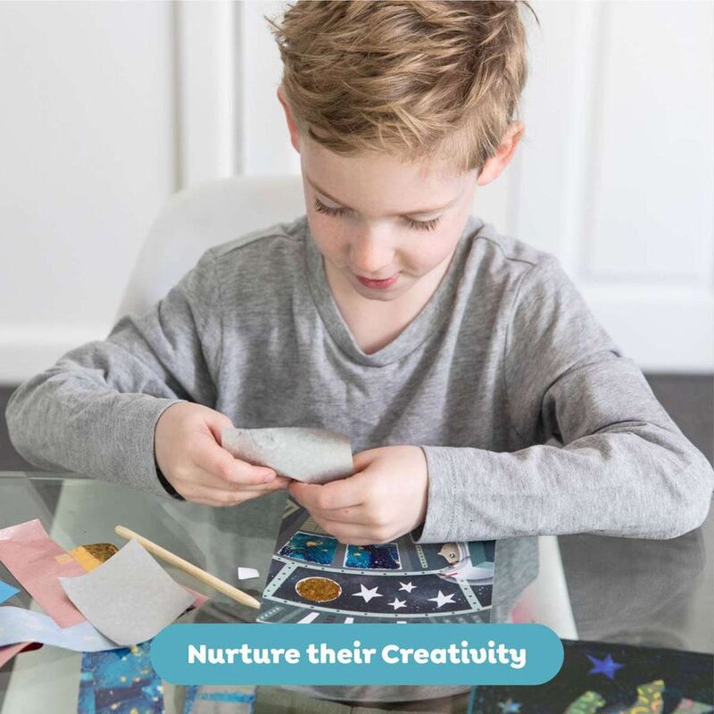 Create intergalactic creations such as space suits, rocket ships, planets and stars with Tiger Tribe's Foil Art Set! Choose a space card and use the wooden lifter tool to peel the holographic foil off the picture to unveil the adhesive sections.