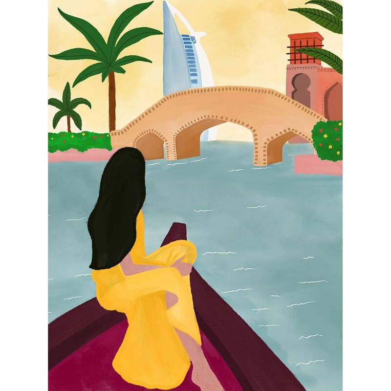 In "Dubai Dhow," a girl enjoys a peaceful ride in a traditional dhow boat, surrounded by the stunning sights of Dubai. The iconic Burj Al Arab towers on one side, while traditional barjeel houses reflect the region’s rich heritage.