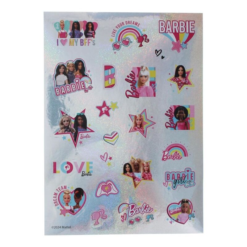 Introducing the latest addition to our enchanting collection of stationery delights: the Barbie sheet of stickers, a captivating creation designed to add a sprinkle of glamour and charm to any project. Crafted under the prestigious Barbie license, this sheet encapsulates the timeless elegance and style synonymous with the iconic doll herself. Each sticker reflects the essence of Barbie's world, from glamorous fashion ensembles to dreamy accessories, promising to ignite the imagination of Barbie enthusiasts of all ages. Measuring at a perfect 13 x 22cm, this sheet of stickers offers a generous canvas for creativity to flourish. Whether adorning notebooks, scrapbooks, or crafting projects, these holographic stickers shimmer and shine, capturing the essence of Barbie's effervescent spirit. With 23 holographic stickers in each sheet, the possibilities for embellishment are endless. Transform mundane surfaces into vibrant showcases of Barbie's world, infusing every creation with a touch of magic and wonder. As the manufacturer, Blueprint Collections takes pride in delivering quality stationery that exceeds expectations. Our commitment to excellence ensures that each Barbie sheet of stickers is meticulously crafted to uphold the standards of both Barbie enthusiasts and stationery aficionados alike. From the intricate detailing to the vibrant hues, every aspect of this sticker sheet is designed to inspire creativity and ignite a sense of joy. Indulge in the enchanting world of Barbie with this captivating sheet of stickers, brought to you by Blueprint Collections. Whether you're a lifelong fan or a newcomer to Barbie's enchanting universe, let these holographic stickers transport you to a world of endless possibilities, where dreams come to life with just a touch of imagination and a dash of sparkle.