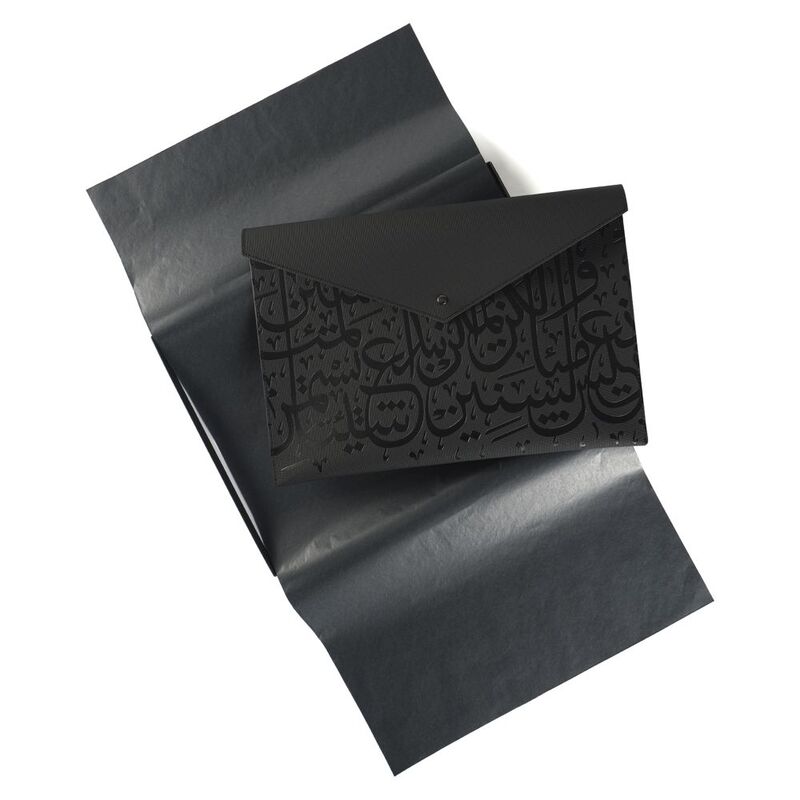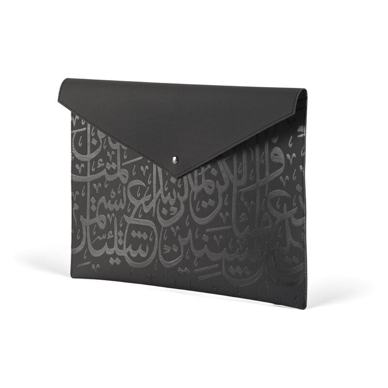 Sustainably made in Italy from vegan leather and with open-spine stitching, the calligraphy pattern is the perfect inspiration for carrying around papers, your laptop or other valuables.