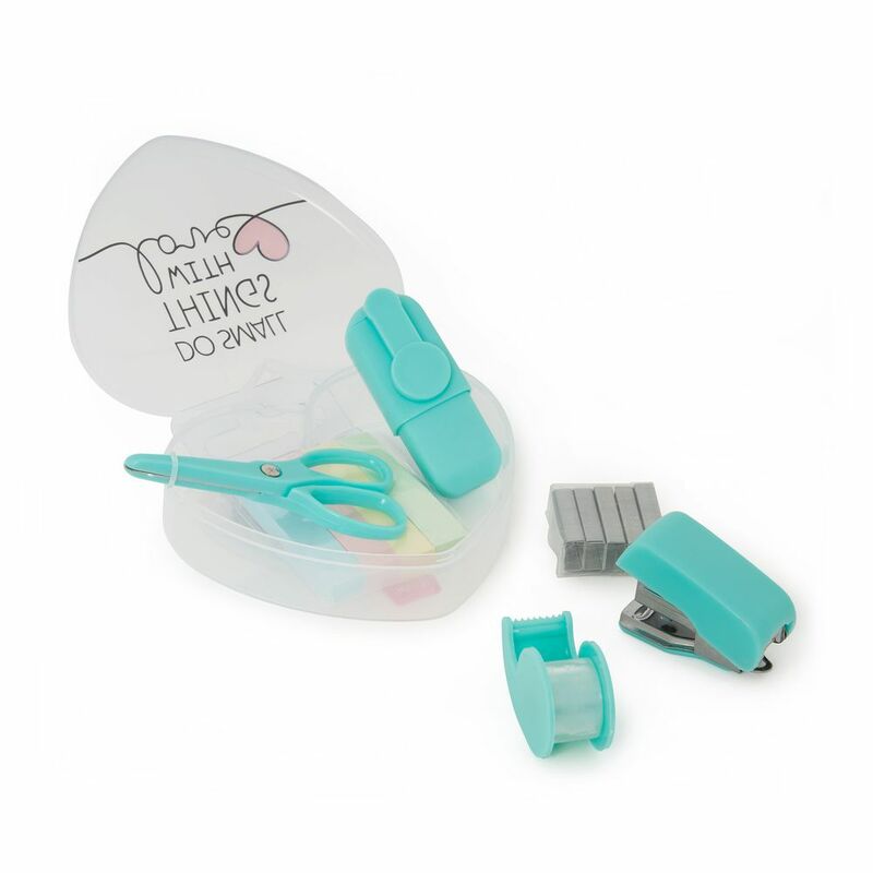 - The set includes 6 mini accessories: scissors, higlighter, page markers, adhesive tape with dispenser, stapler and staples