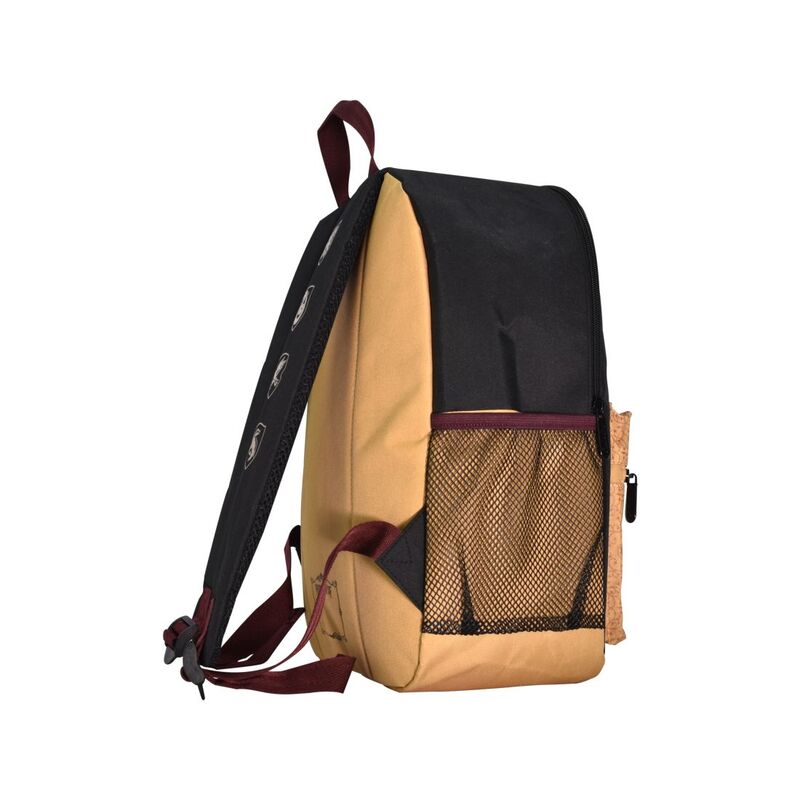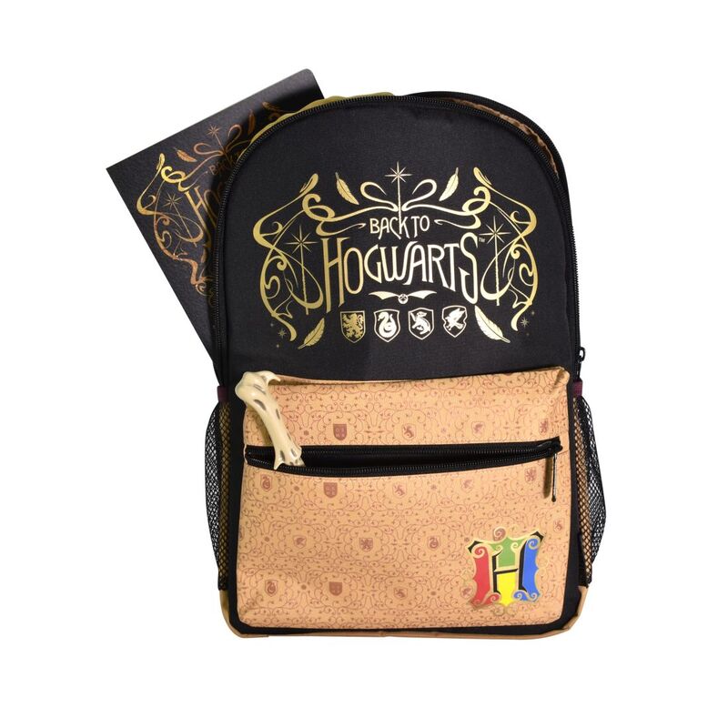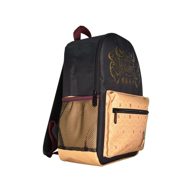 Large Sized Black Nylon Backpack With Front Zipped Pocket, Side Meshed Pockets, Pattern Accents And Coat Hookl. Harry Potter Graphics Featured Around The Backpack Including Back Panel.